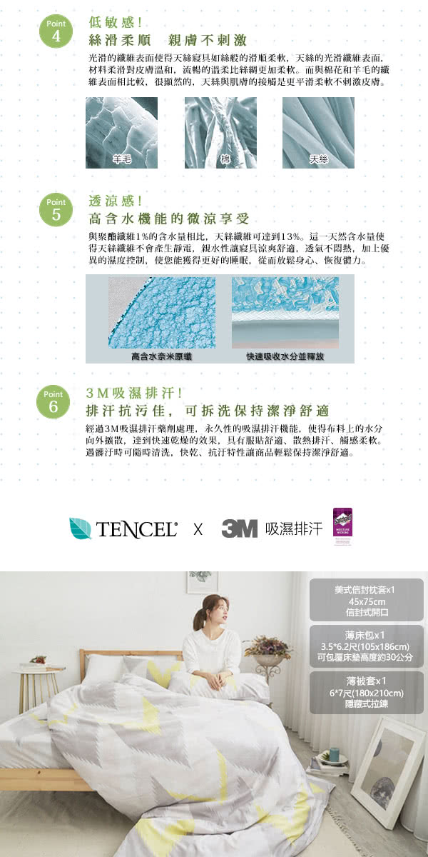 ◇尺寸:薄床包-3.5×6.2尺(105×186公分)/可包覆床墊厚度:約30公分±5%;薄被套-6×7尺(180×210公分);美式信封薄枕套-1.5x2.5尺(45×75公分)±5%